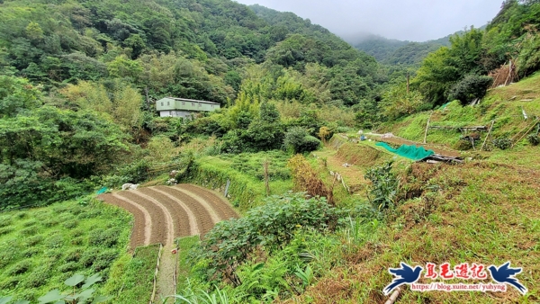 古道隨之爬上山坡間,眼前是山谷梯田菜園,對面山腰處有一鐵皮屋民宅(番子坑16號),直行菜園旁小路後一小段古石階爬上,