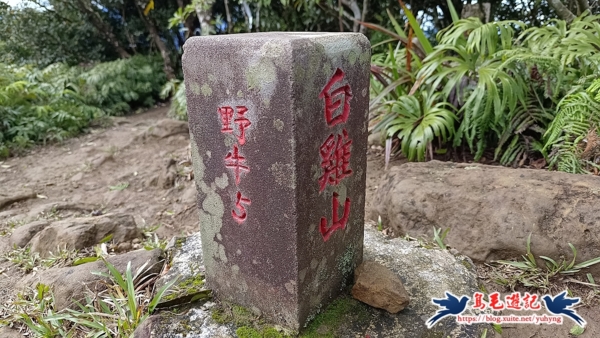 白雞山,海拔734公尺,山頂有顆野牛5號基石,展望佳,可遠眺三峽地區及台北盆地,也可遠眺東眼山、南北插等名山。