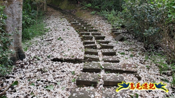 水泥塊鋪設的步道沿山坡只是小起伏而已,遇叉路左上是石桌椅休息平台,然後下來與右路會合,沿途已有桐花飄灑步道上,