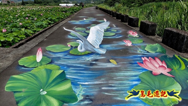 荷花田旁有4隻可愛的小青蛙,有打坐、蹲坐、躺臥及閱書不同姿態,看起來煞是逗趣,柏油路面大師級的3D彩繪栩栩如生,