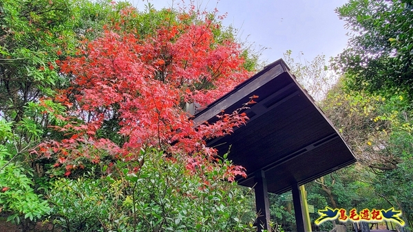 園內涼亭旁後方一株紅楓迎向朝陽,葉色鮮紅欲滴呢~