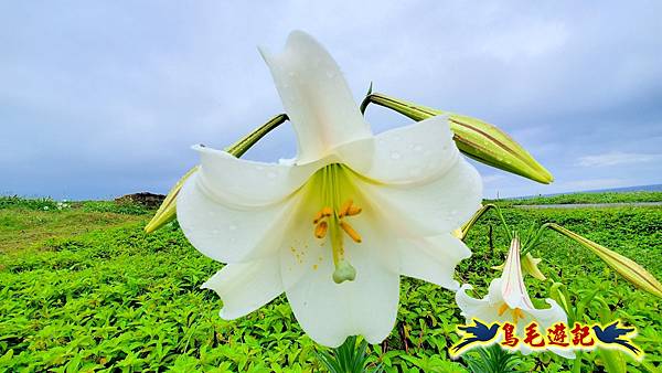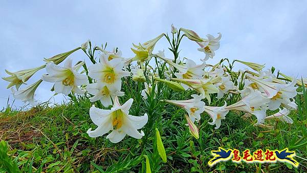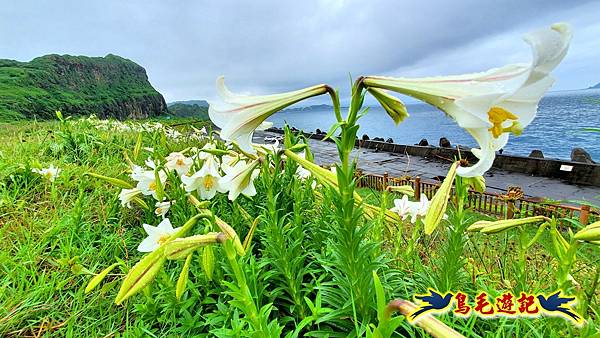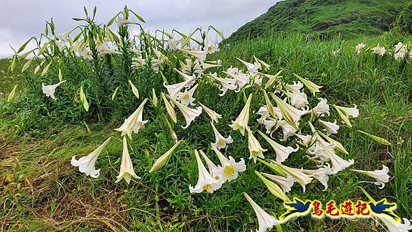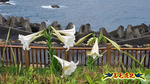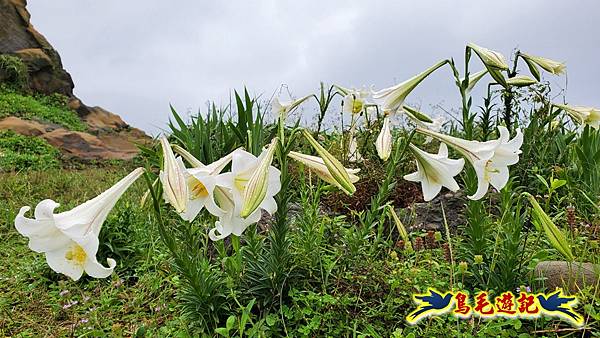走在濱海步道上,看見兩旁草地上有冒出許多野百合,有的是含苞待放,有的白色號角吹向四方,點綴在草地上點點白花,