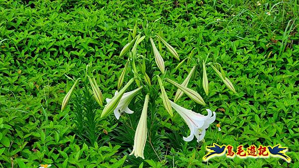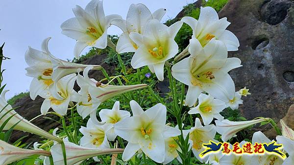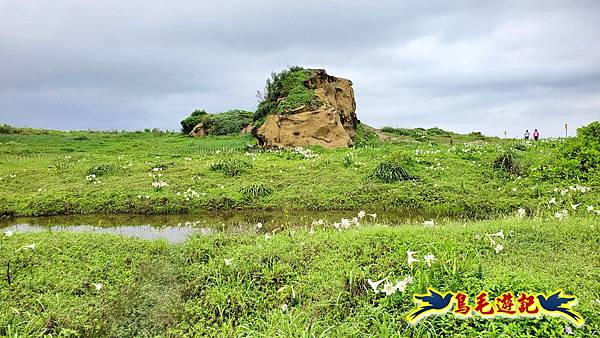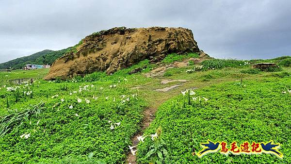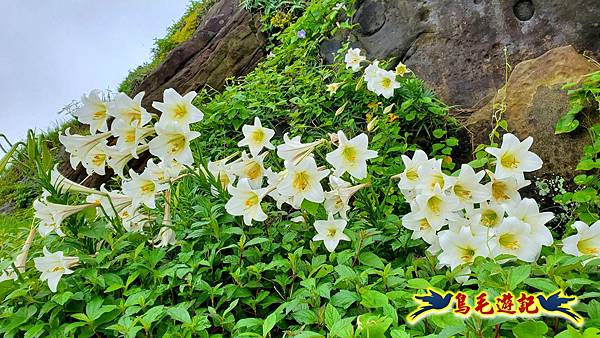 草地上有塊巨岩,名為雙膨山,潔白盛開的野百合圍繞在巨岩周遭,
