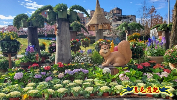 利用葉牡丹、大理花、繡球花、黃白小菊、彩葉草...搭配小動物,公園入口就像是漂亮的小花園,