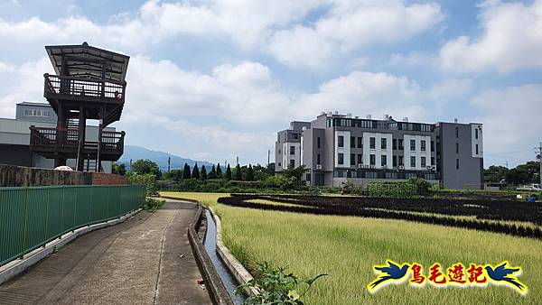 觀景台就位在田寮圳旁,爬上3層樓高觀景台可俯瞰侏羅紀世界稻田彩繪,號稱全台最大的【侏羅紀世界:重生】主題稻田藝術,