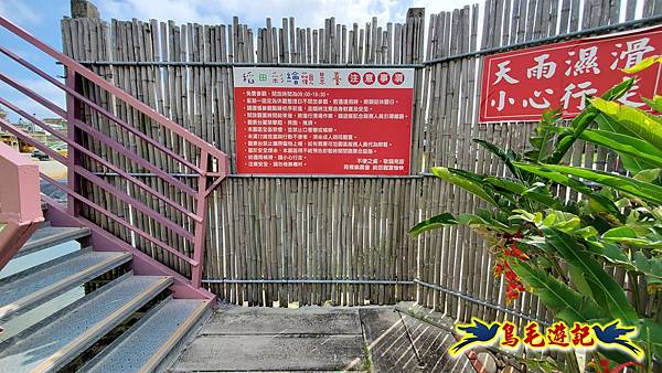 另一處稻田彩繪是位在灣麗路98號的愛情果園旁,以貨櫃屋搭建而成,粉紅色階梯一層層上爬,