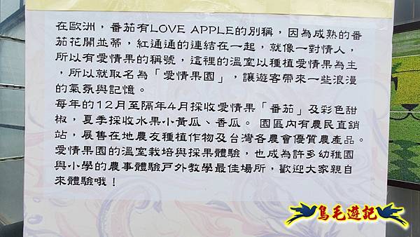 愛情果園係由苑裡鎮農會經營,是一座專注於溫室蔬果栽培的果園。在歐洲番茄有LOVE APPLE的別稱,因成熟的番茄花開並蒂,