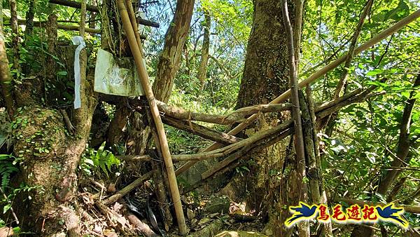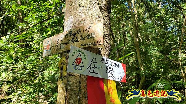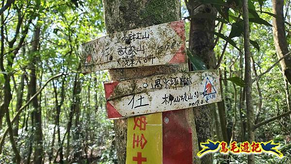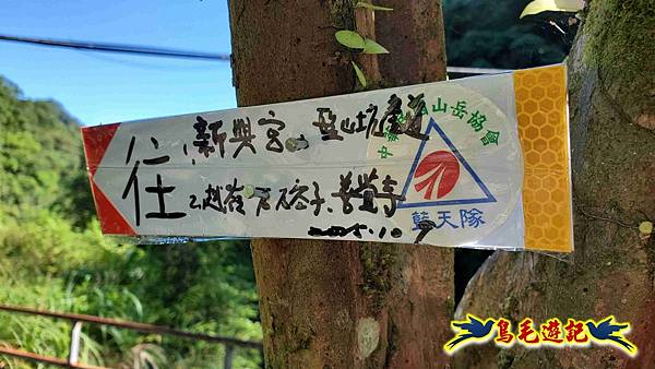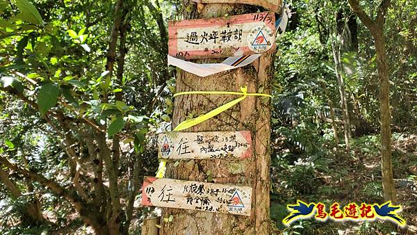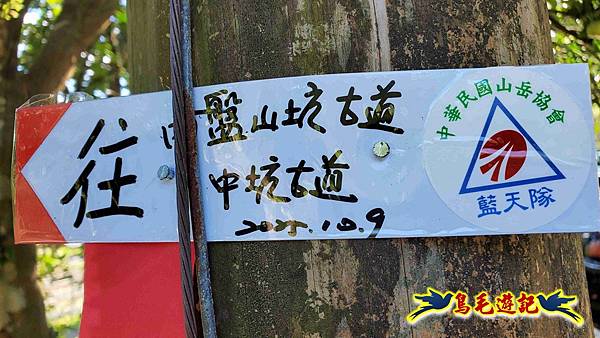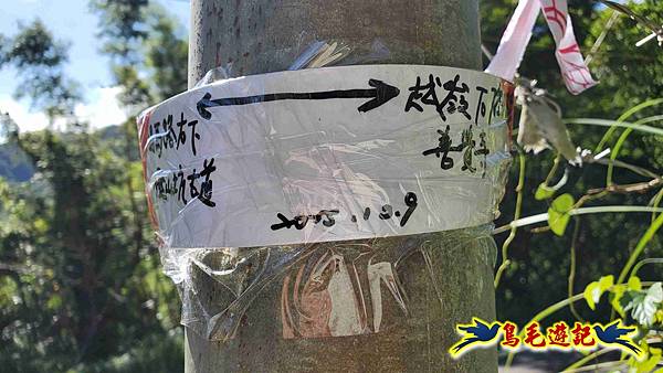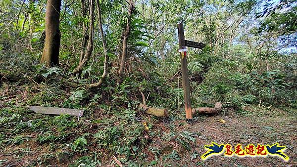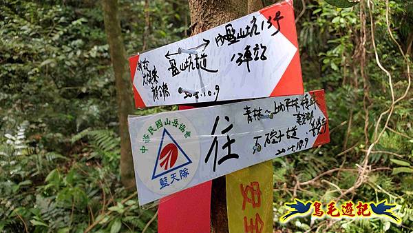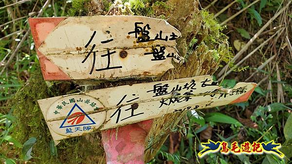 山腰路又接回稜線,漸緩下坡,10:33鞍部叉路,掉落的官方指標經藍天隊以束帶重新固定,直行往畝畝山,左下是往盤山坑,