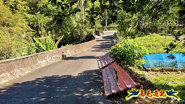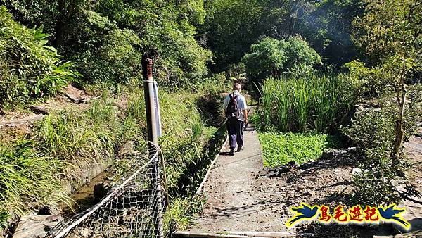 民宅前小水泥路順著溪流與菜園間前行,打開網籬過橋再予恢復關上,林蔭下沿溪行,