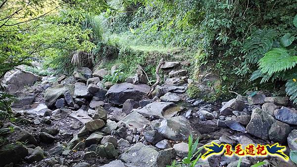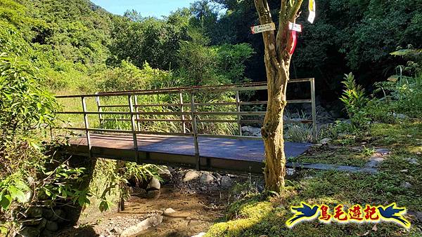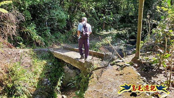 9:03經大石塊橋越過溪溝,沿著菜園農地田埂路走,9:05踏石過溪(若豪雨後大水就無法通過)。
