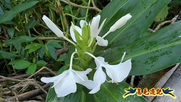 溪畔野薑花開潔白散發清香,9:10鐵板橋叉路,往左過橋通新興宮/盤山坑產道,直行是內盤山坑古道接往中坑古道/中坑西山。