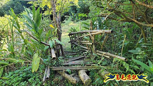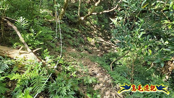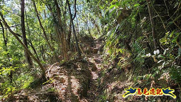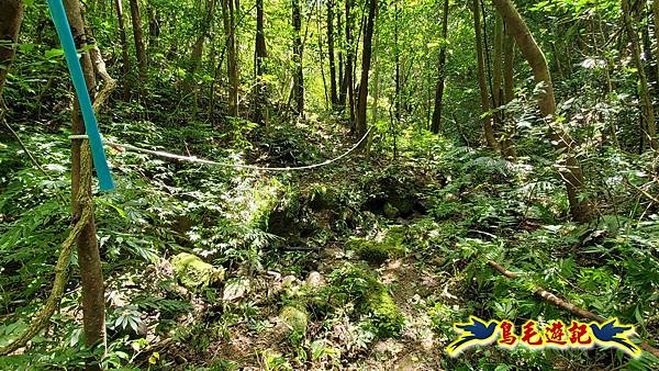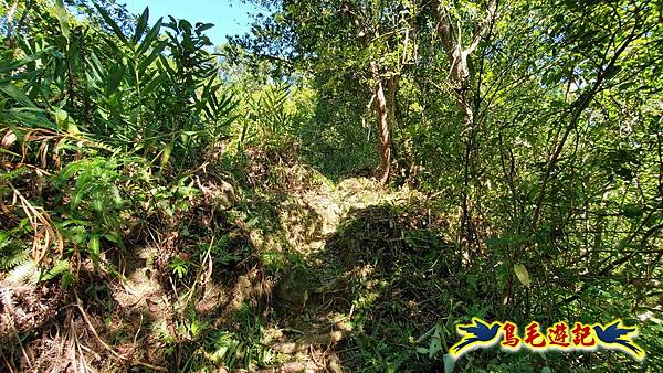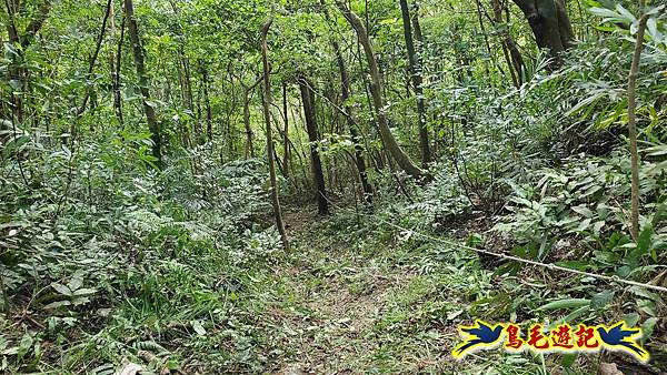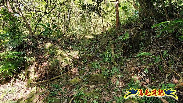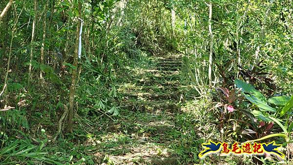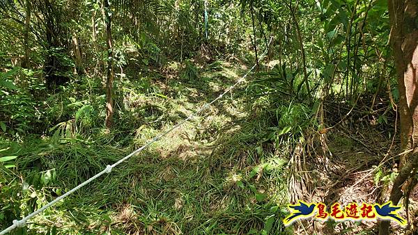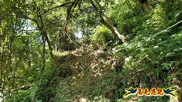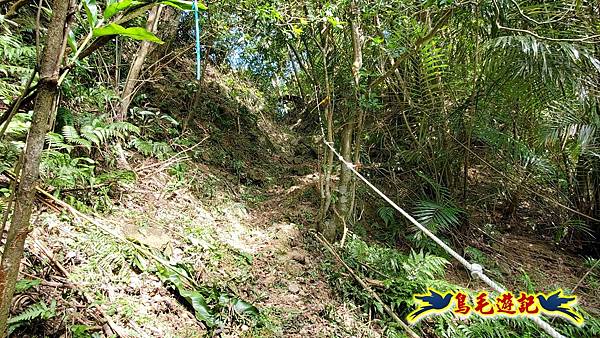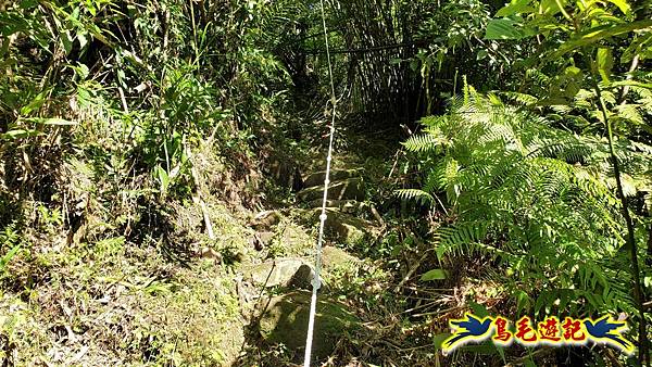 取左過橋,拉繩陡爬,路徑有剛清理過,大石塊階梯經竹林續上爬,