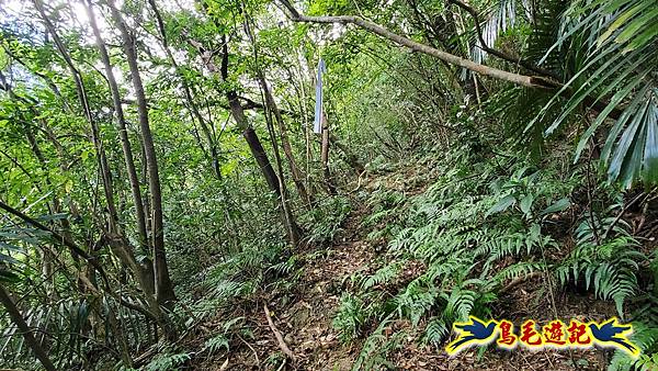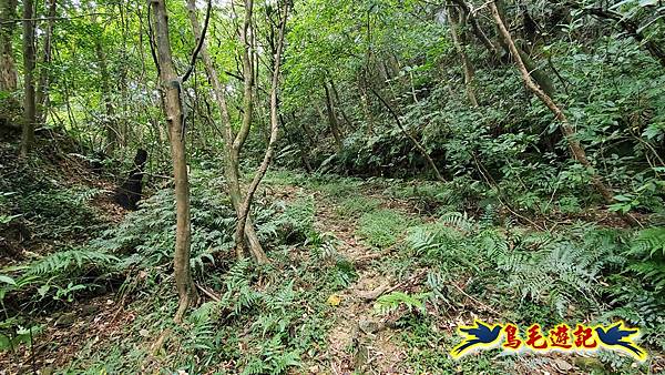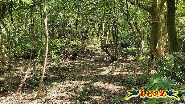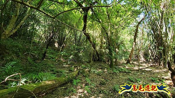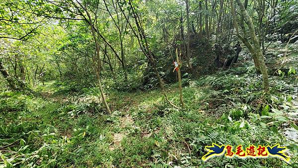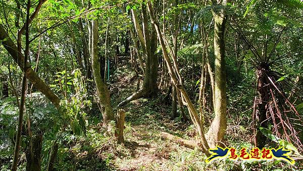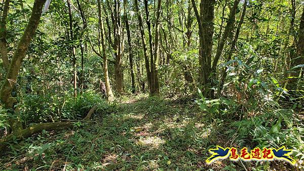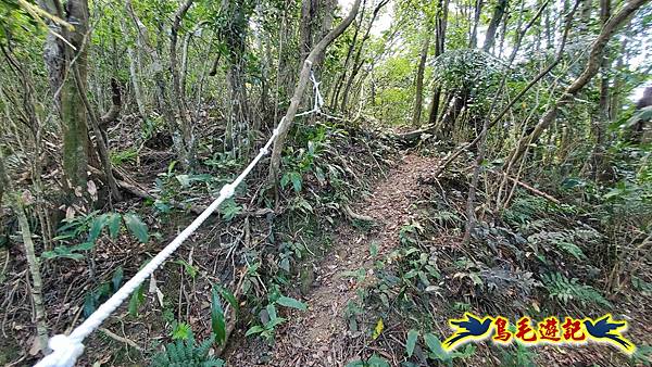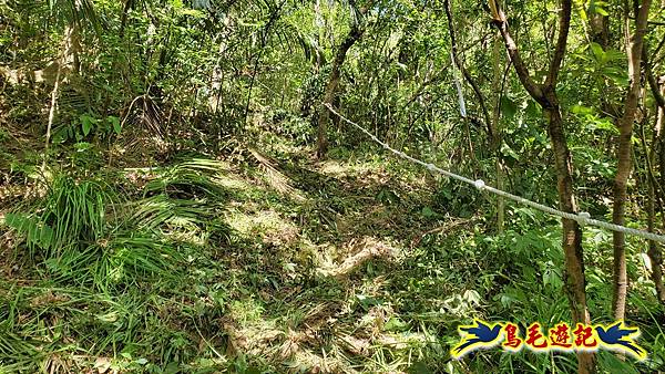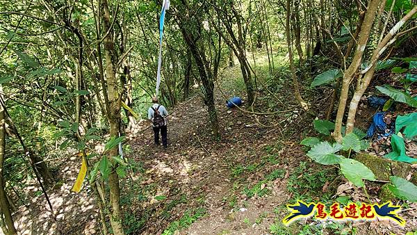 穿越芒草區轉入樹林區,路況轉佳,拉繩爬上,11:55小高地樹下暫歇閒聊,不久遇一位獨行山友從過火坪鞍部反向爬上來,