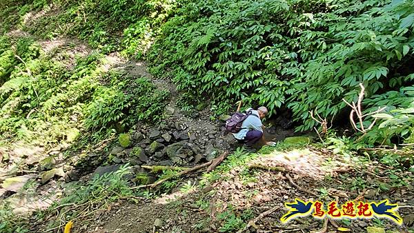 從山坡間拉繩下走,10:49越過乾溪溝,續緩下,