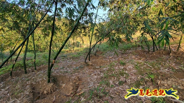 階梯爬上來後是大片綠竹園,地上雜草都有清理過,看不出明顯路跡,偏左前方過來發現很低調路條(顏色很淺又細),續前行,