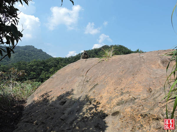 今天烈日當空,巨岩斜坡無遮蔭,狠熱的陽光讓人受不了,迅速離開石燭尖,續從石壁下通過,此後步道一路上坡苦爬,