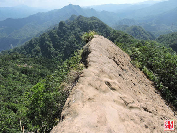 從岩壁爬上通過第一段「岩脊」,早期此瘦脊岩稜路段並無兩側鐵柱繩索護欄,且岩面為凸起的倒U形,行走其上恐怖指數破表,