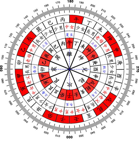 如上二十四山方位圖式,黑色字的為「陰爻」,紅色字的為「陽爻」,立向在紅黑字相兼者,即稱為陰陽駁雜向,其應驗如下:
