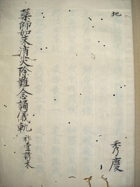 據題記所示,此寫本由寶永六年(按寶永六年為己丑,寫本作乙丑不知道是筆誤還是偽作),即西元1709年由真言宗弟子秀慶所抄。封面題「祚壹請來」,即大正藏底本題記所云:「藥師瑠璃光如來消災除難念誦儀軌一部。一行阿闍梨撰。東大寺奝然弟子祚壹之所請也。而今所刻者。靈雲開山淨嚴和尚之挍本。」寫本題記最早由永久四年(1116A.D.)仁濟上人,到延寶二年(1674A.D.)近世真言宗大德‧新安祥寺流流祖淨嚴上人,到延寶七年(1679A.D.)其弟子契沖上人傳抄的紀錄,歷歷有緒,這是後世捧讀印刷本的弟子不容易接觸到的文獻流傳面。