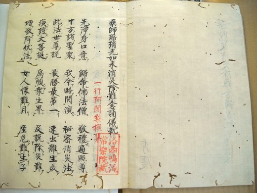透過網購由日本的古書店請到了一部《藥師琉璃光如來消災除難念誦儀軌》的舊寫本,與大正藏第19冊,經號922版本相同,並不是甚麼珍笈秘本。但墨書朱點,蟲蝕斑然,雖然不知道是否具有骨董價值,作為文物收藏,也別有一番興味。
