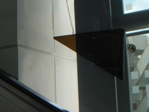 另外,捷運設於電扶梯與牆面夾角間原應為活動式設計的三角警示板,則是有的與牆面卡死,或是根本整塊塞在牆壁縫隙中,有的則是乾脆被貼在牆上「展示」。安全與警示裝置變成陷阱,民眾行進安全堪慮。