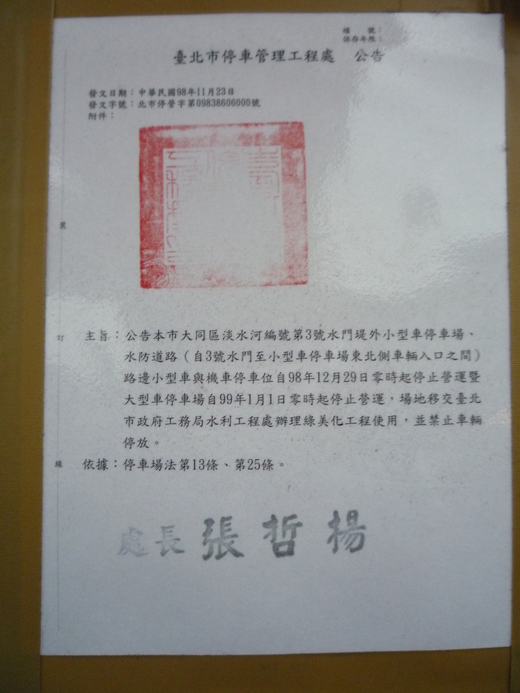 只不過也正因為該項景觀綠美化工程的進行,原本設於延平河濱公園旁,北市大同區3號水門堤外,鄭州路至民生西路底堤防外路段,包含現行作為交九轉運站國道客運調度停車場在內的所有路外與路邊,共438個大、小車停車格位(*大車24格、小車404格、小車身障10格),也都將自