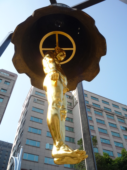 陳玉梅議員近日接獲家住長安西路的陳姓民眾陳情表示,過年前當代藝術館前方廣場突然樹起一座古鐘作為藝術品展示。只是仔細一看卻發現,在鐘的下方卻是掛著一個金色裸男來做為鐘鎚,怎麼看都好像是一座鐘下面掛著一具上吊屍體,特別是到了晚上探照燈一照,更顯陰森恐怖。陳情人批評,裝置藝術應該是要爲市容加分,市府平常怎麼放,只要不是太難看也就算了,只是這次卻趕在過年前在藝術館廣場上吊一具屍體,不僅不吉利,也毫無賞心悅目可言。