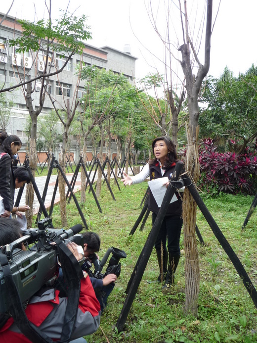 只不過陳玉梅議員近日卻接獲家住民族東路的方姓民眾反映表示,北市府自今年1月起開始在民族公園內的人行步道兩側大量新植樹木。但樹苗種下不到2個月,至今年2月起就發現有枯黃現象,而至4月份,更有多株新種樹苗已經枯死。眼見公園兩側花博園區工程正如火如荼進行中,但鄰近「花海隧道」一線之隔的民族公園卻已變成「枯木枝道」。市府花了大錢卻做成這樣的品質,花博會時恐將變成國際笑話。