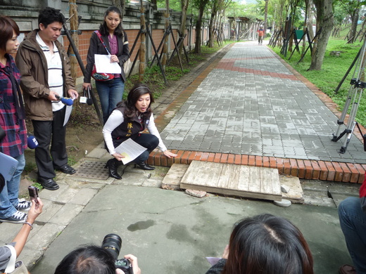 而更離譜的是,「花之隧道」民族公園段工程雖標榜要加強園內綠美化植栽與「隧道」無障礙設施,但市府對於一線之隔外的人行步道卻未同步要求。結果好不容易剛重鋪完成的透水磚步道,卻還要另外墊木板彌平高低落差;公園內涼亭與樓梯地面也是處處青苔。而民族公園南側由捷運局代管區域,如今也是階梯破損嚴重,廢棄物四處棄置,走道上更是雜草叢生。以現況來看,根本看不出「民族公園」地處花博熱區核心位置的地位。