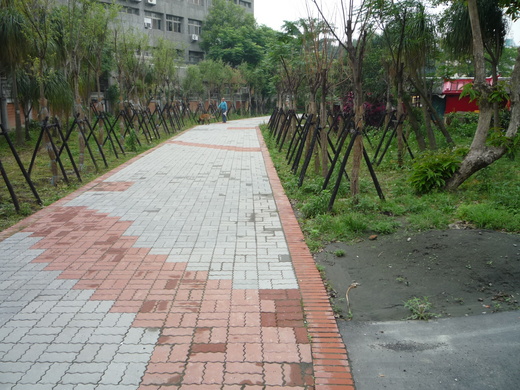 而更離譜的是,「花之隧道」民族公園段工程雖標榜要加強園內綠美化植栽與「隧道」無障礙設施,但市府對於一線之隔外的人行步道卻未同步要求。結果好不容易剛重鋪完成的透水磚步道,卻還要另外墊木板彌平高低落差;公園內涼亭與樓梯地面也是處處青苔。而民族公園南側由捷運局代管區域,如今也是階梯破損嚴重,廢棄物四處棄置,走道上也是雜草叢生。以現況來看,根本看不出「民族公園」地處花博熱區核心位置的地位。