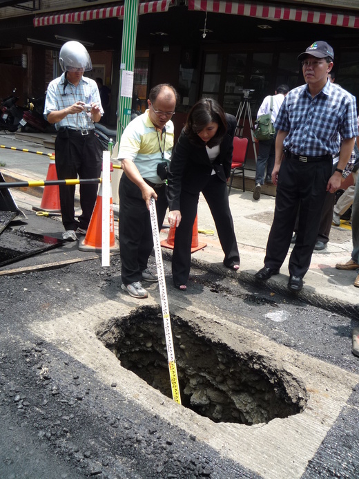 陳玉梅說,市府97年編列6000萬預算,推動長春抽水站擴建工程,在地下涵管埋設完成後,即因地基回填不實,曾導致路面塌陷,如今又因路平專案路面鑽出大洞,顯有回填不實情形,要求市府處理。