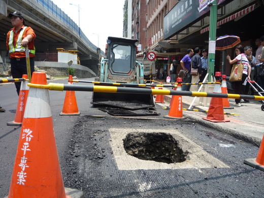 在台北市新生高架橋底下的長春抽水站,因為長期使用,造成附近地基被掏空,最近進行路平專案路面整平工程時,竟然還補出了2個大洞,最深甚至將近