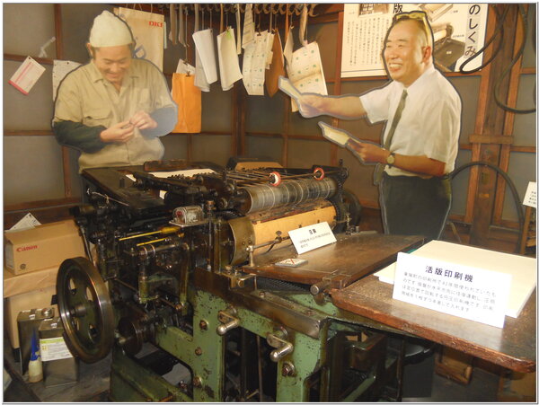 【下圖照片:東京市郊~柴又『寅次郎』紀念館內展示60年前活版鉛鑄字體印刷機】
