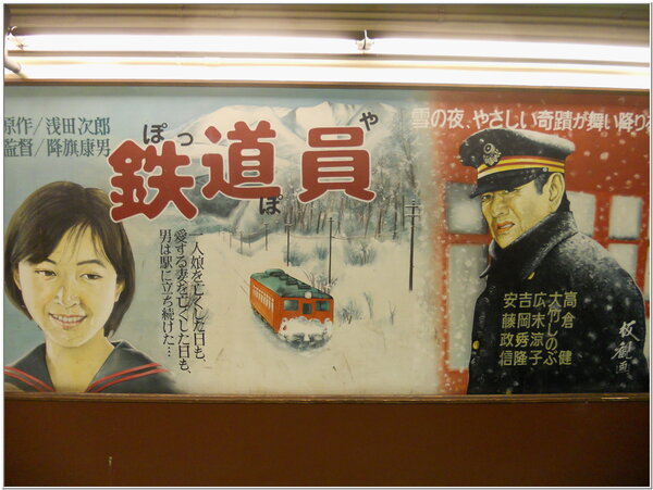 地下道月台走道20年前彩繪了許多幅大型懸掛經典復古電影看板,包含30年前知名電影演員『高倉健』的代表作品『鉄道員』劇照,完全手工繪製精緻看版栩栩如生,搭配青梅車站月台打造日式復古昭和年代候車室及貴賓室....等,是與眾不同的東京下町特色樣貌。