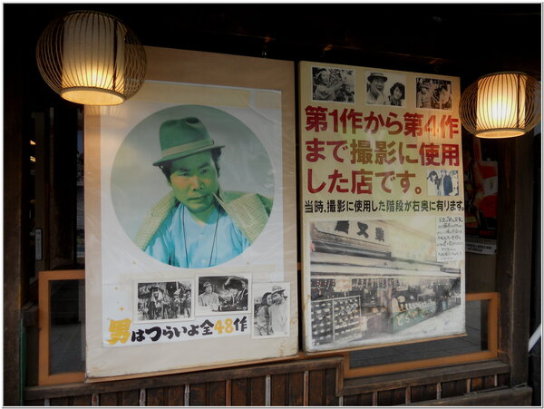 明治時期,日本近代大文豪家『夏目漱石』也曾經來到東京市郊下町柴又的『帝釋天』寺廟附近進入老街『川甚』的店家用餐,『川甚』日式料理店自明治時期至今已傳承了好幾代子孫仍在營業,柴又老街兩旁盡是古老店家,這裡不僅能走訪電影『男人真命苦』場景,另有復古零食糖果店、玩具店、文具店、品嘗和風甜點糯米糰子店、鰻魚飯店....等日本道地料理,柴又懷旧老街各式各樣店家和電影場景一模一樣,令遊客流連忘返讚嘆不虛此行。