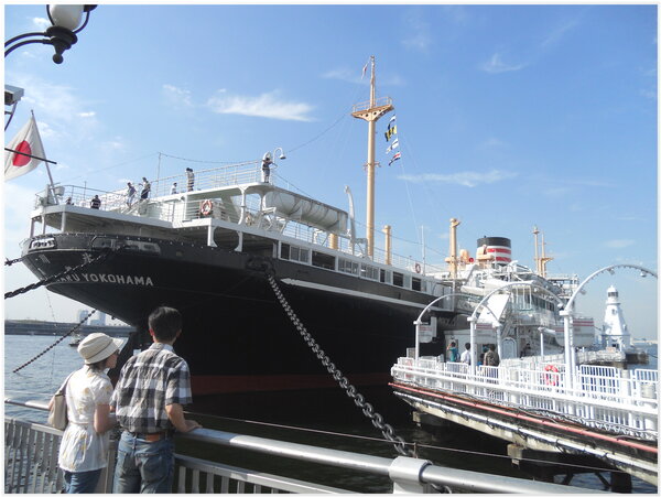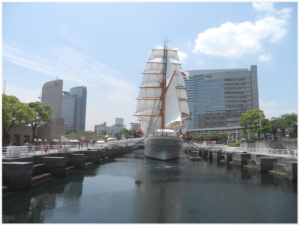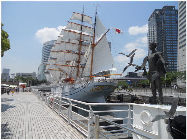 停泊在橫浜旧港區碼頭的『日本丸』(帆船),白色船體及優雅船型,素有『太平洋の天鵝』(太平洋の白鳥)之稱。