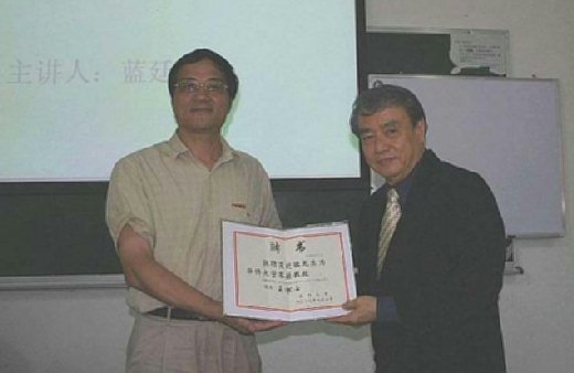 「【中新社泉州六月五日電】著名華文詩人、攝影家、建築師雲鶴,今日欣然受聘華僑大學客座教授。華僑大學副校長張禹東為其頒發聘書。