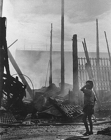 聳立著但已燒焦了的一段斷柱把太陽劈成兩半。那是三月的某天午後,他在曾經炫耀過繁華但在一次大火中化成廢墟的“華人區”中,看到一個裸足的拾破爛的小孩在碎磚焦土間拾掘可換得晚飯的鏽鐵,——陽光把小孩的面給曬得紅紅的像個醉酒的中年人。