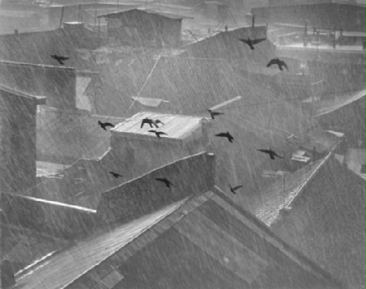 這多麽熟悉的畫面。屋蓋。褐色的屋蓋,鏽腐了的屋蓋,深與淺灰的屋蓋。層層疊疊重重覆覆的組成,極其厭倦的單調構圖。雨季來臨,便像一座座破舊的鋼琴任憑風雨彈奏,哭泣的鍵不斷傳播嗚咽令人心煩的噪音。單調的色彩,單調的構圖,單調的音聲,如此單調的我的窗。