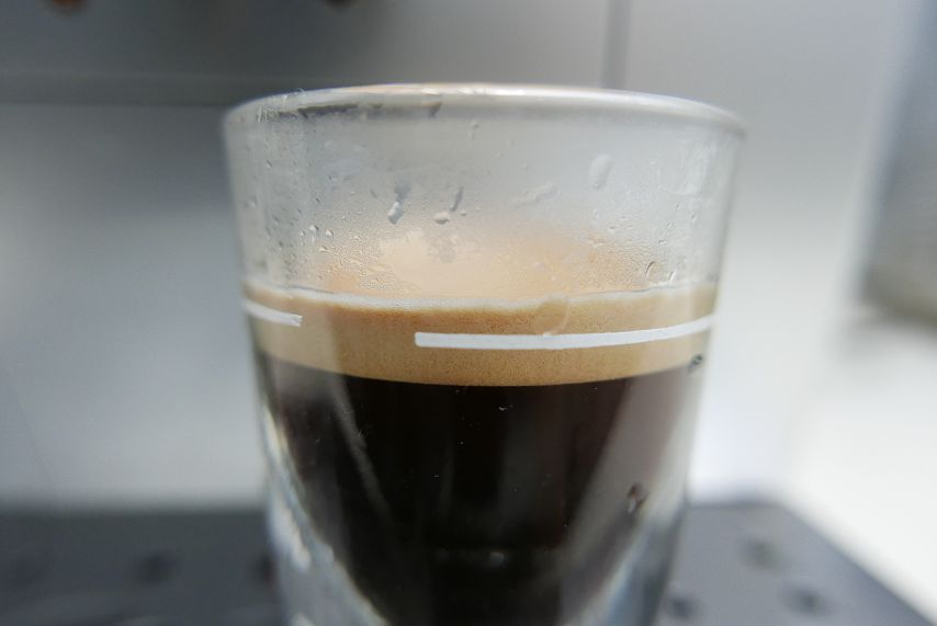 義式咖啡好不好喝,看crema就能略知一二,顏色呈現漂亮的榛果色和3mm左右的厚度。Delonghi迪朗奇風雅型ECAM22.110.SB泡的義式咖啡,啜飲時,整個香醇的咖啡油脂在嘴裡像綿花糖一樣漫開來,和半自動咖啡機泡的espresso比已經相差無幾了。