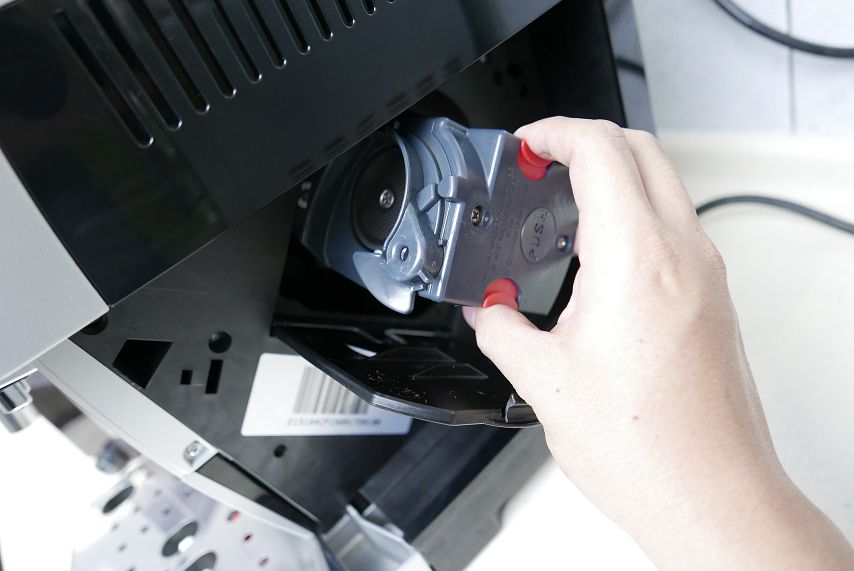 另外,按下沖泡器兩側的紅色按鈕,就能拔下沖泡器,直接拿到水龍頭下沖水清洗,不需要用額外的藥錠,真的好簡單,比起上一台大到一個不行的沖泡器要好拆多了,櫃台小妹下班前稍微拆下來,拿去水龍頭下沖一下就好了,也不用額外晾乾,直接裝回去就可以了。