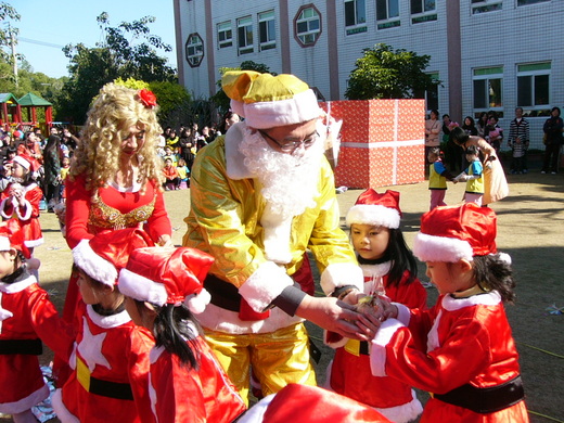 一起表演同歡,聖誕老公公也提著整袋的小雪人禮物,分送給每個小