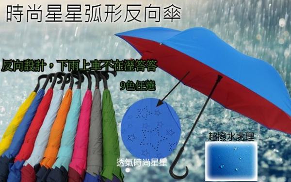 反向設計,上車收傘時不會卡車門,進車內比較不會溼答答,可自行站立晾乾!