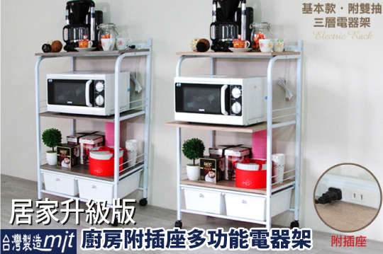 家中的小家電超多種,沒地方放只能靠組合櫃、組合架,但一般的組合家具總有些限制,讓人感覺到有點不足。「台灣製-居家升級版廚房三層二抽附插座多功能電器架」更貼近麻吉的需求,內附雙插座設計,擺放各式小家電剛剛好!