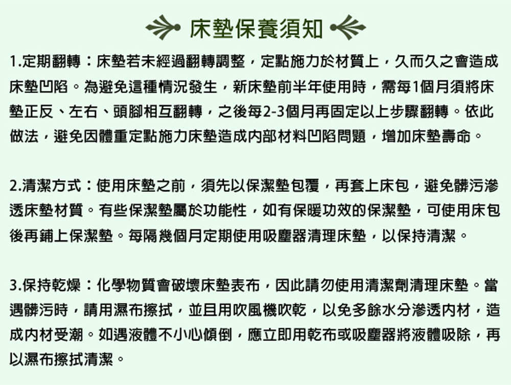 ※床墊不可水洗,使用前請先舖上保潔墊或床包,避免髒污沾染。若不慎有髒汙沾染,建議使用清水部分清潔。