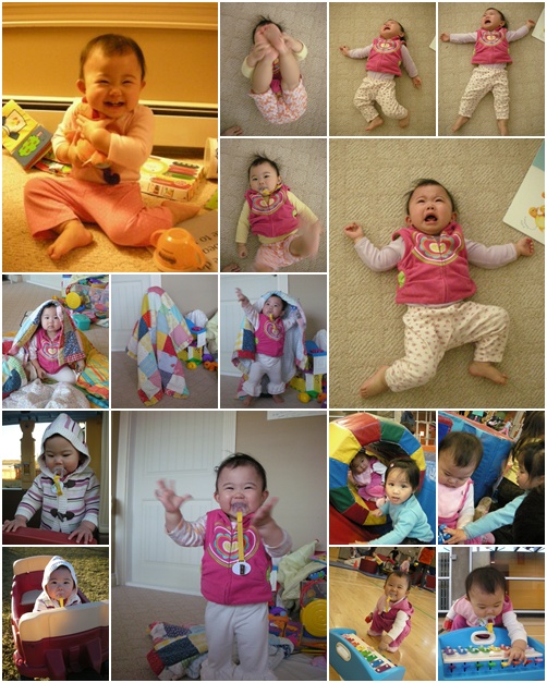 現在 Ingrid 愈大,不管是看著她自己玩樂,或是陪她一同遊戲,都變得愈來愈有意思。像她上了幾個月的音樂課後,漸漸收到成效。現在她會自己從她的玩具中放音樂,然後自得其樂地擺動身體或轉圈跳舞。有機會就會假裝躲起來,和我玩躲貓貓。會拖著她的寶寶毯全家跑,並和我玩 Peek-a-boo。還會假裝面無表情,然後突然大叫來"嚇"我。去遊樂場也開始會主動上前,與其他小朋友一同玩,一點都不害羞。