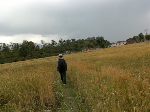 既已陷在這片金黃色的迷宮中,索性遠眺昨晚才下過雪的喜瑪拉雅山,討論著這幾天夜半突然颳起的驚人山風和緊接而至的雷電交加的大雨,原來這就是讓山頂白雪更厚實的原因呀!聊完天氣再低頭看著田壟中許許多多識與不識的花草,不禁對此地豐富的物種發出連連地讚嘆。就在此時農家的院子出現一個抱著孩子的年輕婦女,她似乎看出我們的窘境,用手勢指引我們行進,迷航之旅在抵達她家的院子時終於結束。