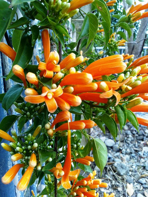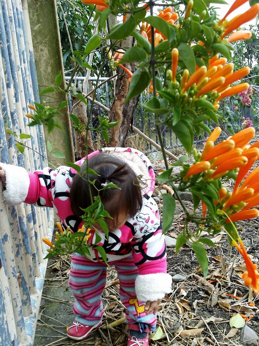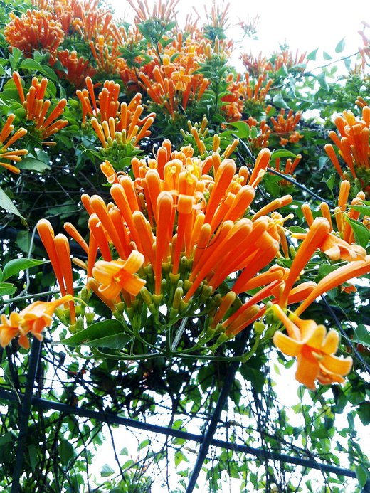 不知何時這一整片燦亮的橘竟恣意妄為地霸滿老家的花架,似串串爆竹串起的花瀑,金碧輝煌的灑落在早春纖纖柔柔的陽光下,彷彿陽光再加點溫,就會瞬間引燃聲聲轟隆隆的巨響,在熱力四射的美麗中,蘊釀著萬馬奔騰的生命力,令人驚艷,牽動著逃不開的視線。