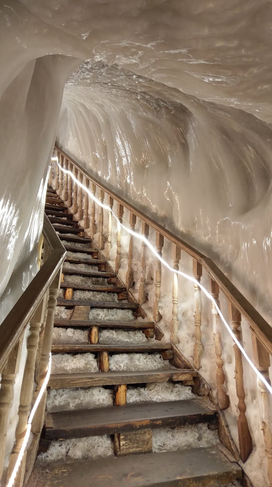 | 沿著樓梯下來,周圍結冰, 洞內零下18度, 但由於洞不大, 一下子就走完了, 所以也不會覺得太冷, 反而是外面比較冷. |