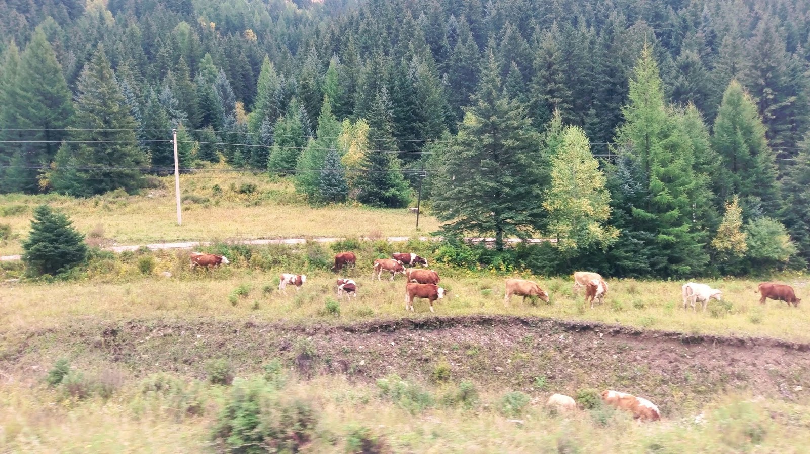 | 走出萬年冰洞, 繼續搭車前往懸空村, 路上還有牛群在吃草. |